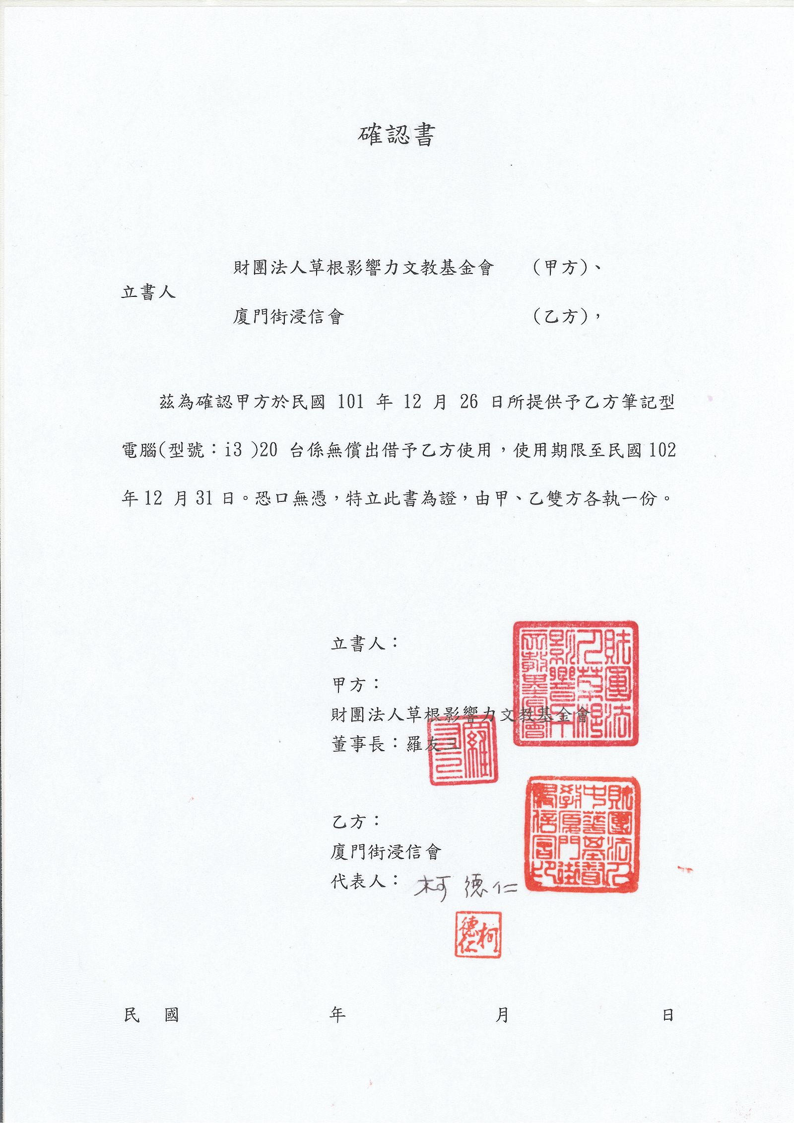 為降低數位落差,提升社區弱勢家庭及年長者的數位能力,草根影響力文教基金會特於102年01月致贈20部筆記型電腦給廈門街浸信會