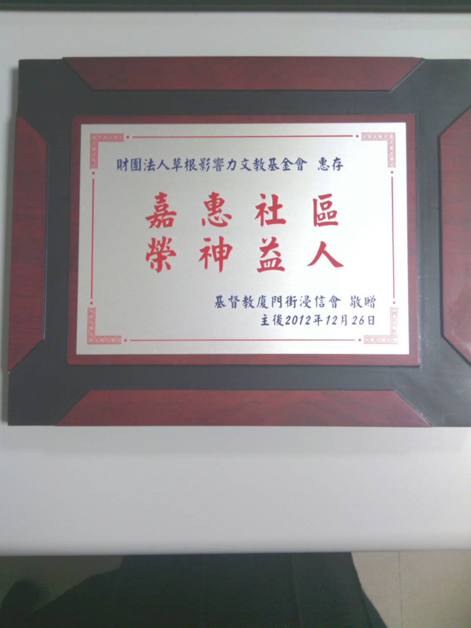 【廈門街浸信會回贈草根影響力文教基金會感謝牌】