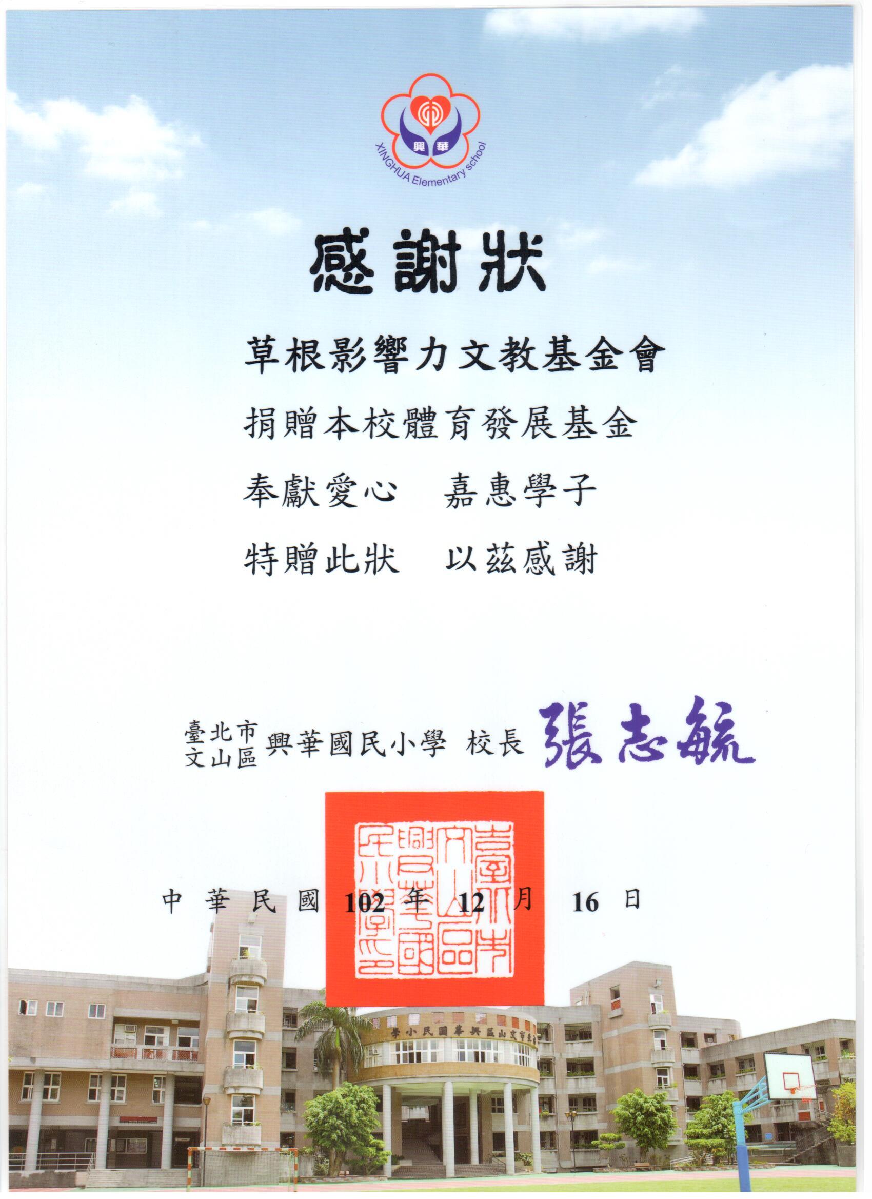【興華國小回贈感謝狀給草根影響力文教基金會】