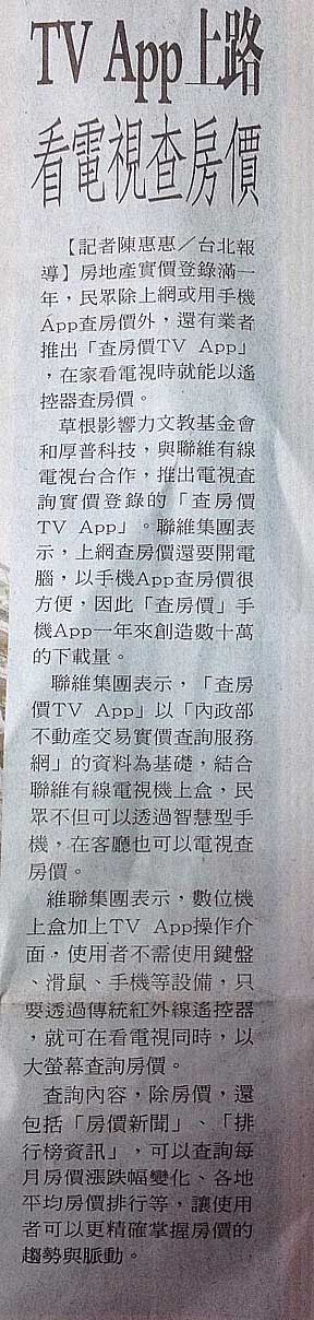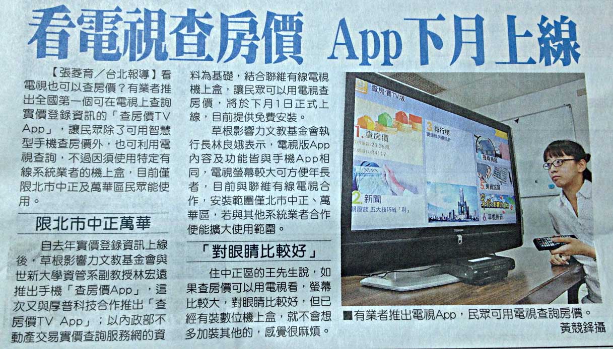 自去年實價登錄資訊上線後,草根影響力文教基金會與世新大學資管系副教授林宏遠推出手機「查房價App」,這次又與厚普科技合作推出「查房價TV App」;以內政部不動產交易實價查詢服務網的資料為基礎,結合聯維有線電視機上盒,讓民眾可以用電視查房價,將於下月1日正式上線,目前提供免費安裝。