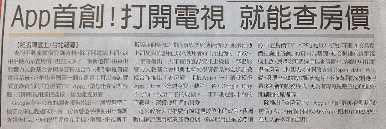 去年實價登錄資訊上線後,草根影響力文教基金會,與世新大學資管系副教授林宏遠合作推「查房價」手機App,一上架就獲得App Store不分類免費下載第1名,Google Play不分類下載第2名的成績。 今宣布再新推「查房價TV APP」,以「內政部不動產交易實價查詢服務網」資料為基礎,結合聯維有線電視機上盒,可使用該服務的是聯維有線電視數位機上盒用戶。