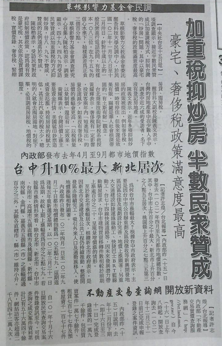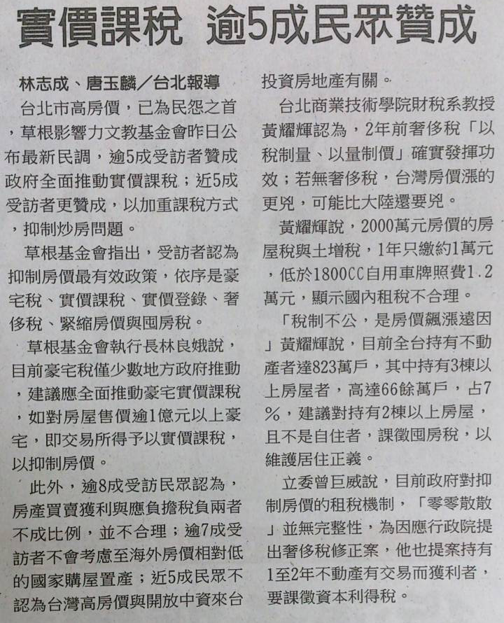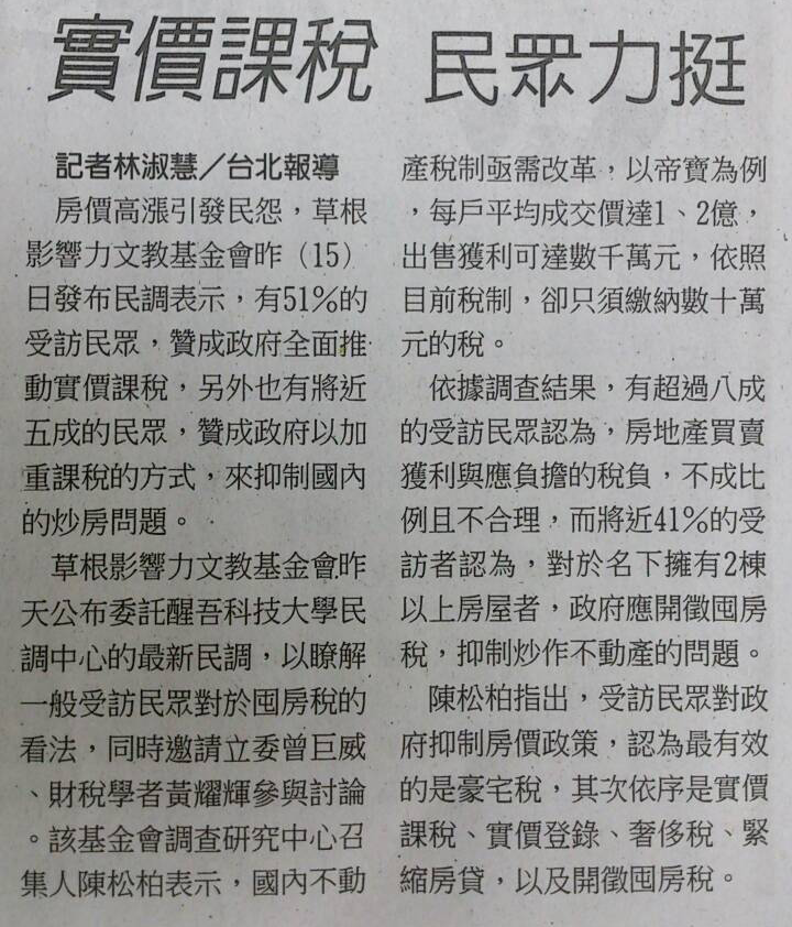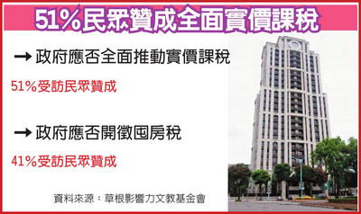 台北市高房價,已為民怨之首,草根影響力文教基金會昨日公布最新民調,逾5成受訪者贊成政府全面推動實價課稅;近5成受訪者更贊成,以加重課稅方式,抑制炒房問題。