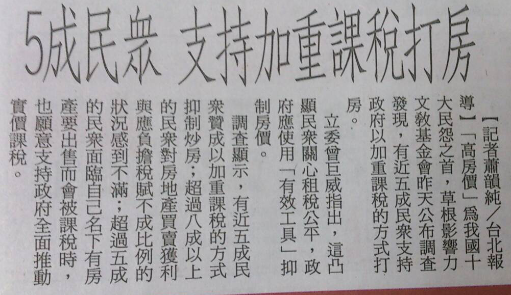 高房價成為十大民怨之首。學者認為,2011年奢侈稅上路後,確實有助於抑制房價上漲,不過,資金行情過於氾濫,加上財產稅制不夠健全,才是造成房地產飆漲的主因。