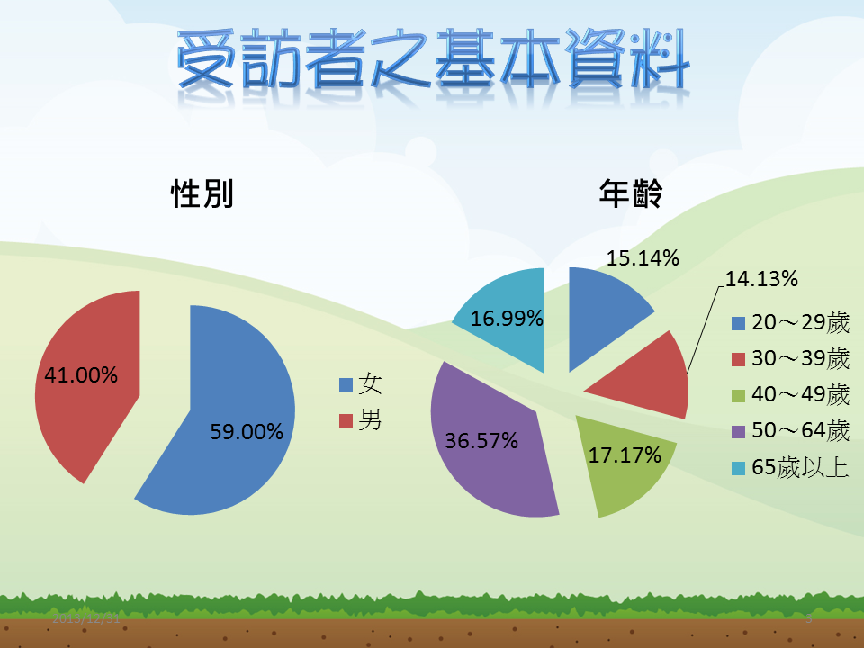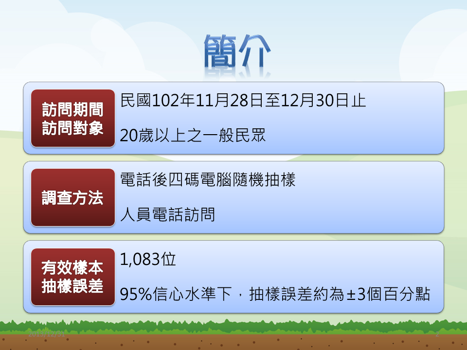 草根影響力文教基金會委託醒吾科技大學民調中心,於民國102年11月28日至12月30日,針對20歲以上的一般民眾進行電話訪問,有效樣本1083位。在95%的信心水準下,抽樣誤差為正負3個百分點。