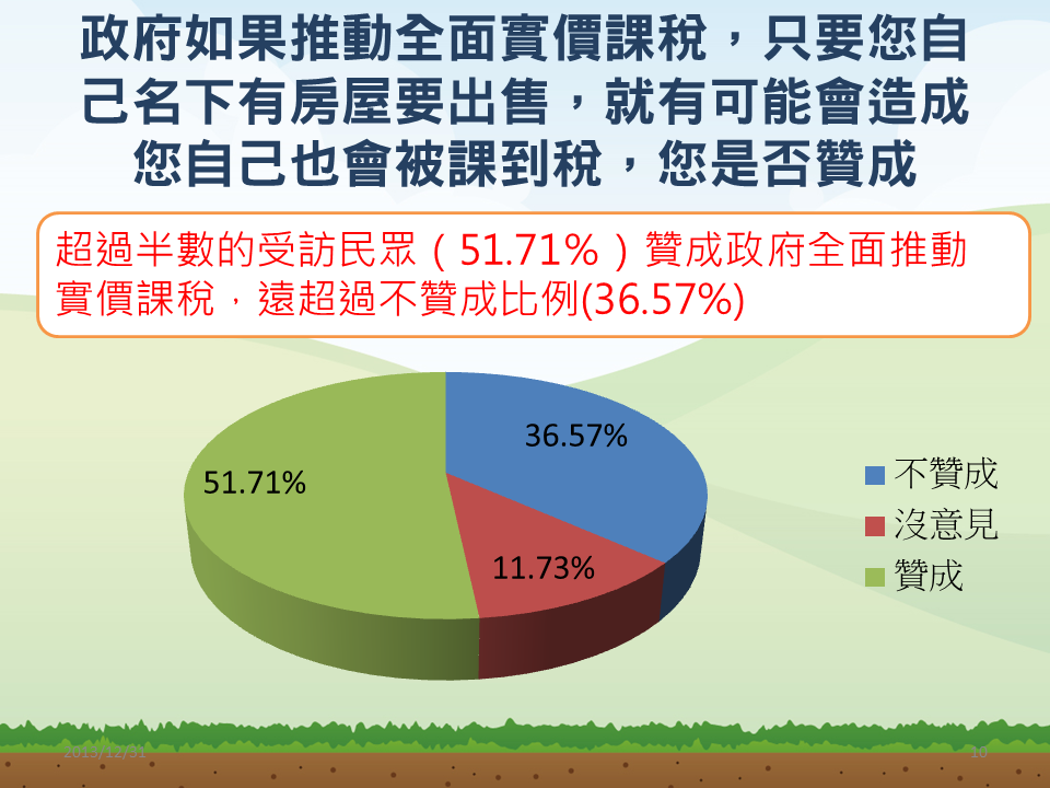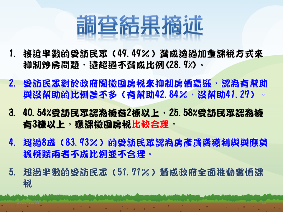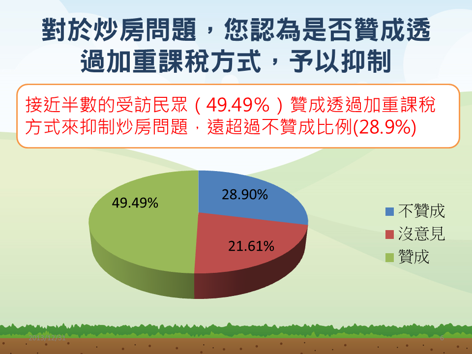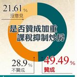草根影響力文教基金會委託醒吾科技大學民調中心調查,針對1083名20歲以上民眾透過電話訪問,發現近5成民眾贊成加重課稅方式抑制炒房問題、有28.9%民眾不贊成。