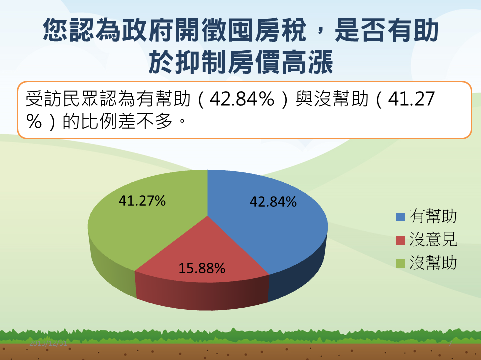 政府打囤房,民眾怎麼看?草根影響力文教基金會特別委託醒吾科技大學民調中心調查1083位20歲以上民眾,結果有49.49%的受訪民眾贊成以加重課稅方式抑制炒房問題,並有51.71%贊成政府全面推動實價課稅。