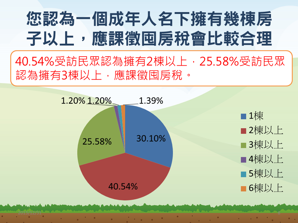 依據調查結果,有超過八成的受訪民眾認為,房地產買賣獲利與應負擔的稅負,不成比例且不合理,而將近41%的受訪者認為,對於名下擁有2棟以上房屋者,政府應開徵囤房稅,抑制炒作不動產的問題。