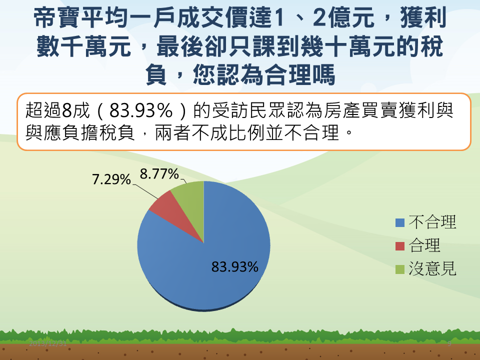 草根影響力基金會調查研究中心召集人陳松柏指出,像「帝寶」每戶平均成交價達1~2億元,出售獲利達上千萬元,卻只須課徵幾十萬元的稅,逾8成受訪民眾認為不合理。
