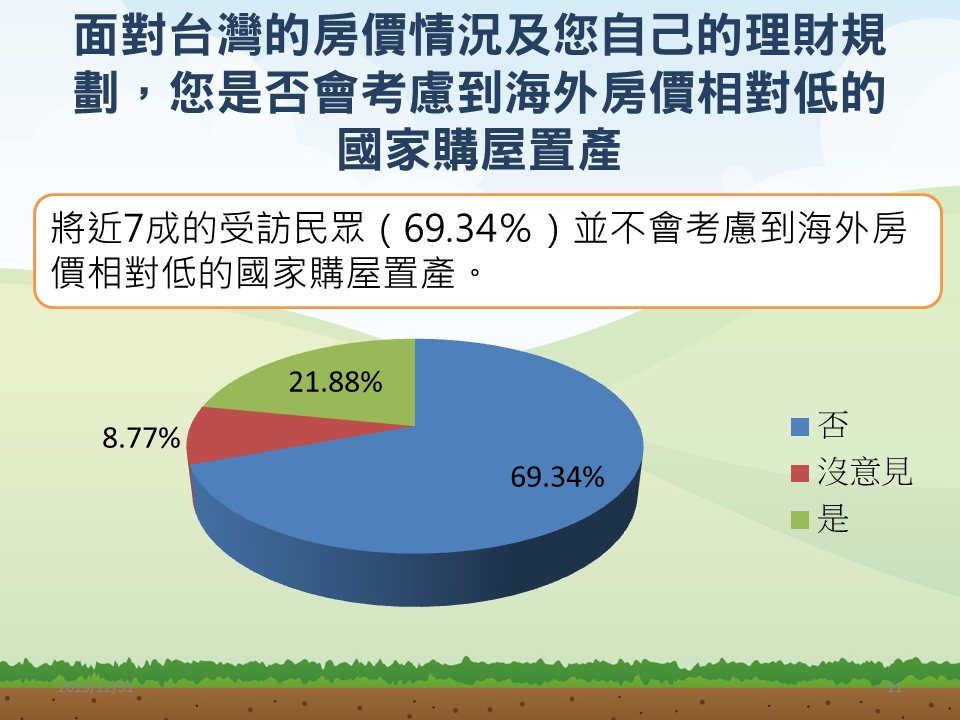 對於政府推動實價課稅,若民眾出售自住房產也要課稅,有51.71%民眾贊成推動、36.57%不贊成;近期海外置產夯,但調查顯示有近7成民眾並不考慮至海外房價相對低的國家置產,有意願到海外置產的族群以20~29歲較高。