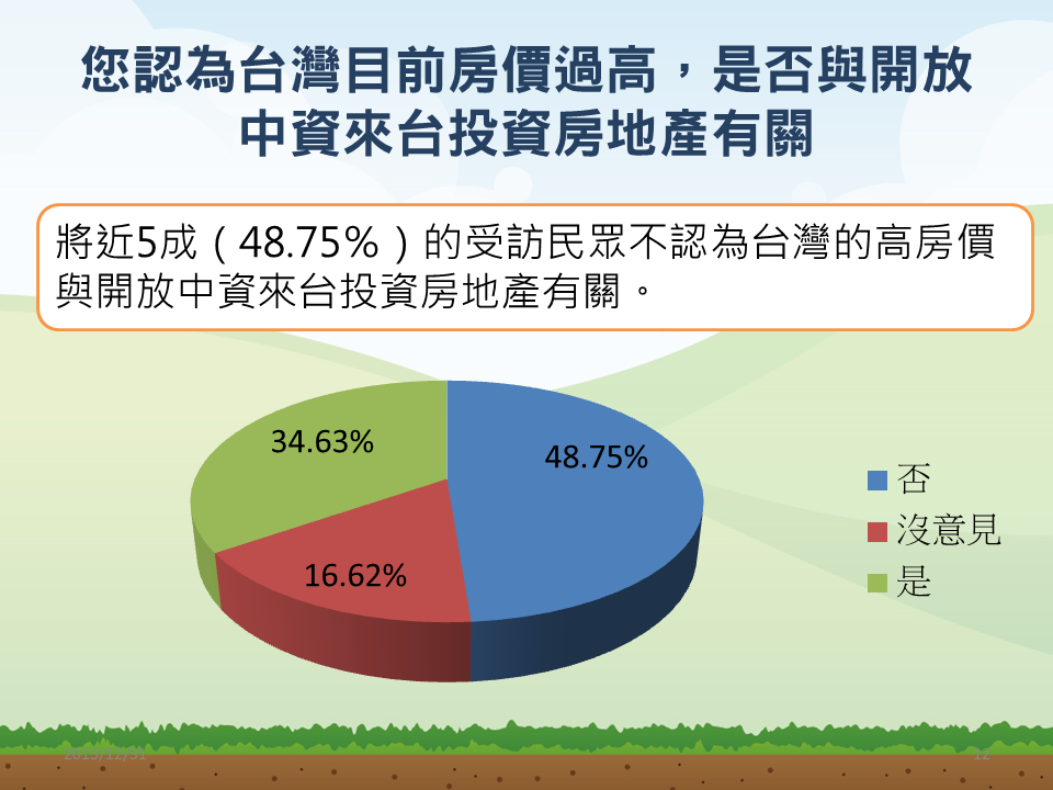 這份民調為草根影響力文教基金會委託醒吾科技大學民調中心,於2013年11月28日至12月30日,針對20歲以上的一般民眾進行電話訪問,有效樣本1083位,在95%的信心水準下,抽樣誤差為正負3個百分點。