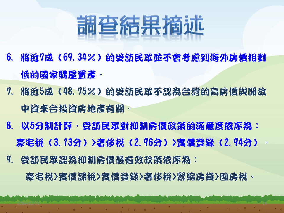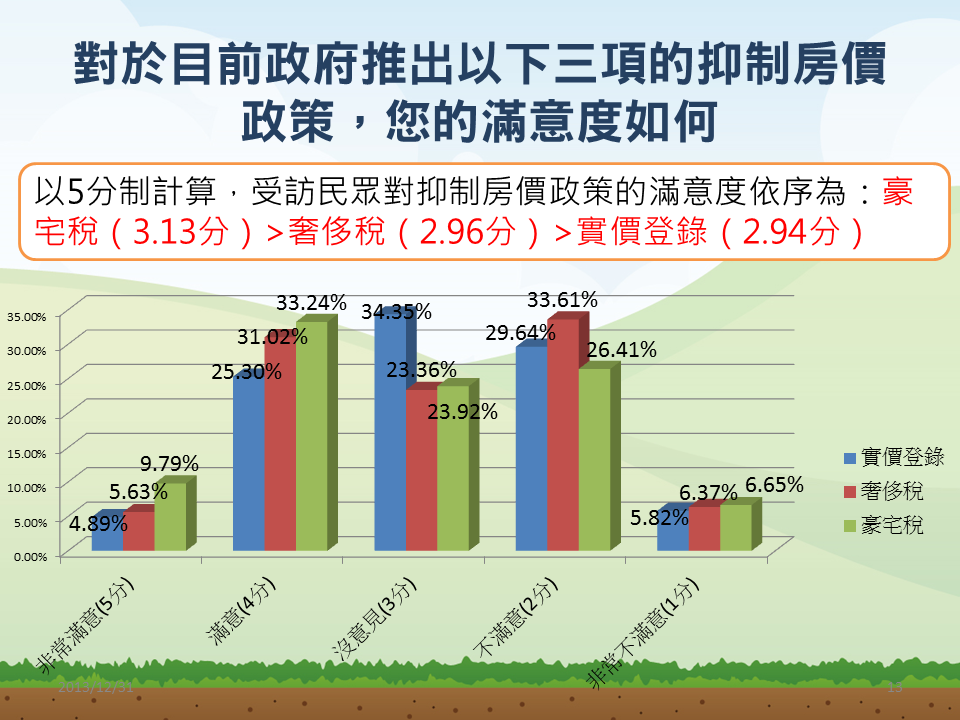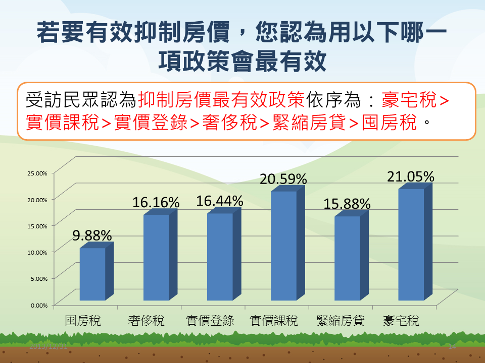 而受訪民眾認為抑制房價最有效政策依序是豪宅稅、實價課稅、實價登錄、奢侈稅、緊縮房貸及囤房稅。