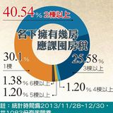 對於1人名下擁有幾棟房產應課徵囤房稅,認為2棟以上就要課的比率最高、佔40.54%,1棟以上的佔30.1%、3棟以上佔25.58%。