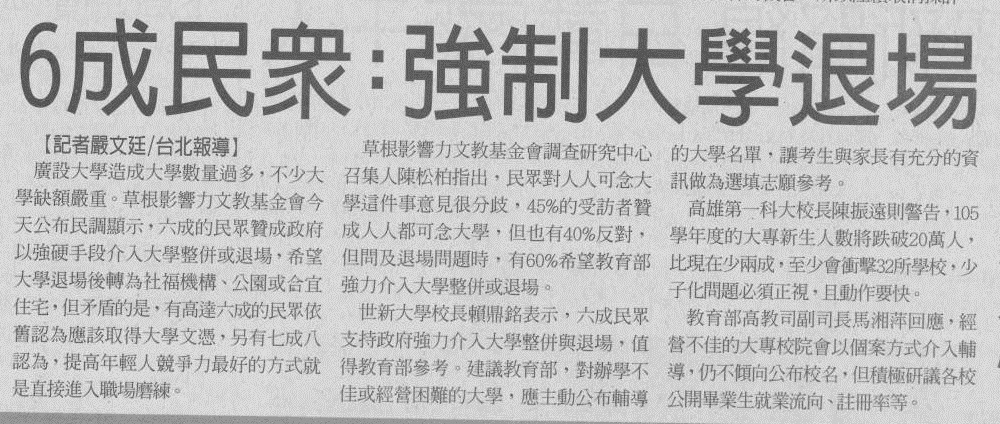 少子化衝擊下,大學退場聲浪不時出現,教育部也在日前公布私校退場機制,要求招生不足或是評鑑不佳的私校退場或轉型,但是仍有許多人認為,教育部作法不夠積極,對此,草根影響力基金會八號發表「大學氾濫,民眾怎麼看」民調結果,指出有百分之六十點四四的民眾認為政府應該以強硬手段介入處理大學整併或退場問題,草根影響力文教基金會調查研究中心召集人陳松柏說:「我們現在政府的政策如果可以得到百分之六十以上的人支持,是很高的支持度,所以我們在這個調查結果是希望給政府一個建議,告訴政府有百分之六十以上的人希望政府建立大學退場時間表。」