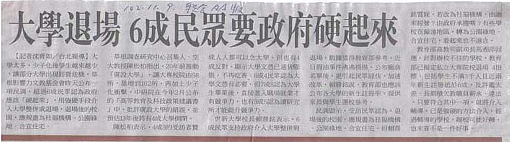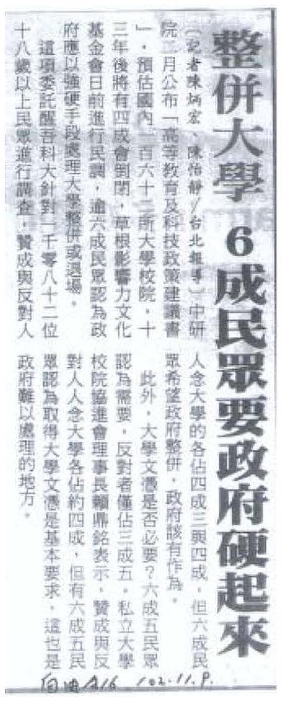另有逾6成的民众认为,政府应以强硬手段介入处理大学整并或退场问题,不赞成的民众仅占16