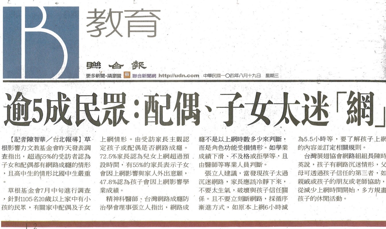15. 【中國網路電子報】草根影響力文教基金會「家庭網路成癮」民調發表會http://goo.gl/3eiCaM