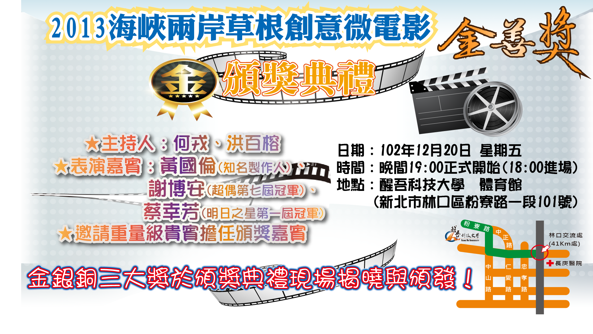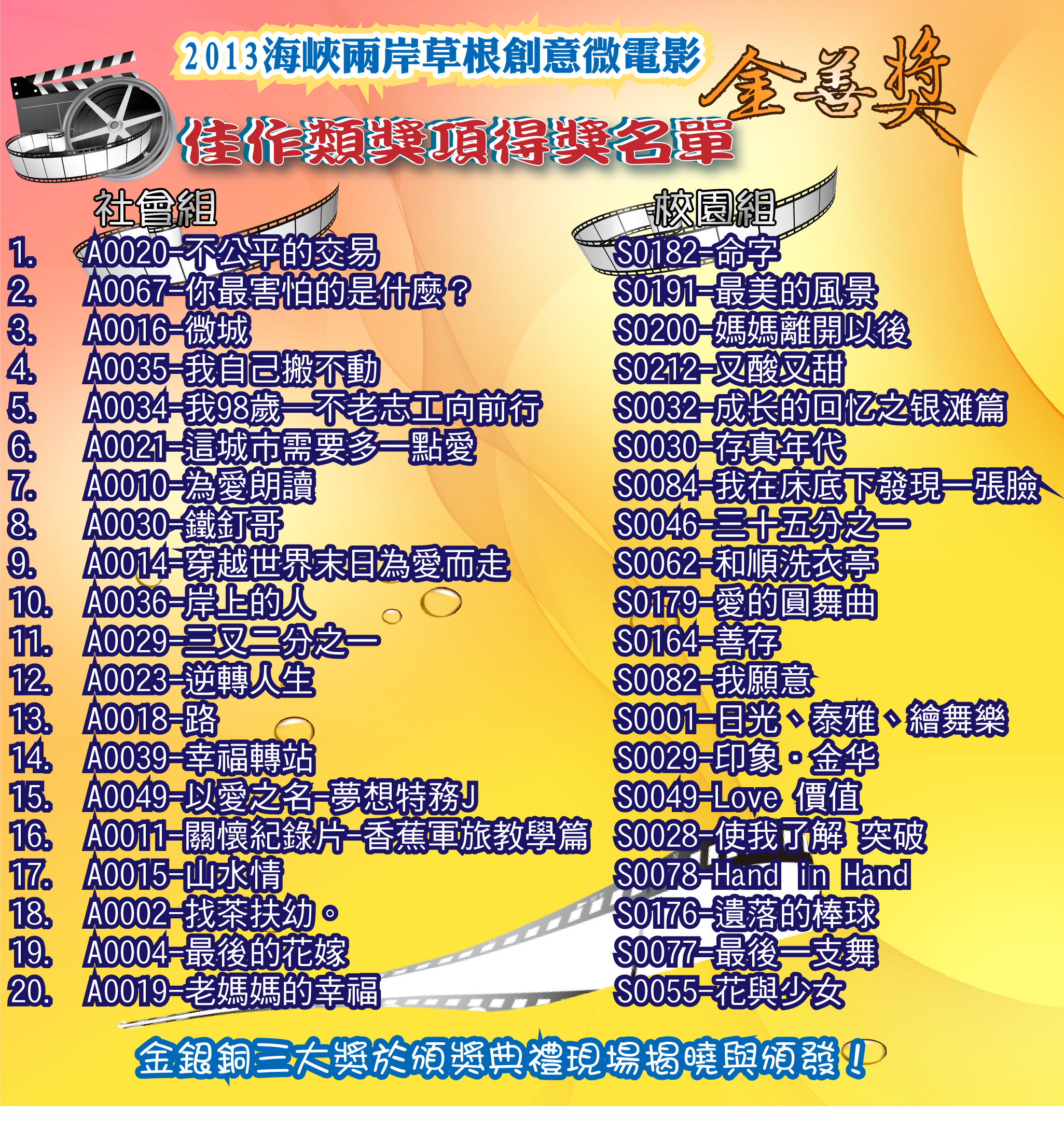 【2013金善獎】20131205_2013兩岸草根創意微電影金善獎_專業及人氣獎項得獎名單 公布!!