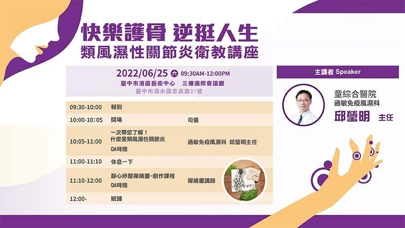 早上起床關節劇痛、手指無法伸展…小心類風濕性關節炎上身! 據統計,全台約有10萬人罹患類風濕性關節炎,更好發於中年婦女,若疾病未好好治療控制,嚴重將會出現不可逆的失能性破壞。童綜合醫院過敏免疫風濕科邱瑩明主任說明,類風濕性關節炎是由於免疫系統異常,引起關節自發性的發炎反應,除了造成關節變形、發炎之外,還可能侵犯全身各個組織器官,影響患者日常行動能力、降低長期生活品質。有鑑於此,邱瑩明主任攜手中華民國類風濕性關節炎之友協會,共同舉辦類風濕性關節炎衛教講座,與民眾與病友來分享類風濕性關節炎之基本認識、治療新知與日常照護,即日起開放報名: