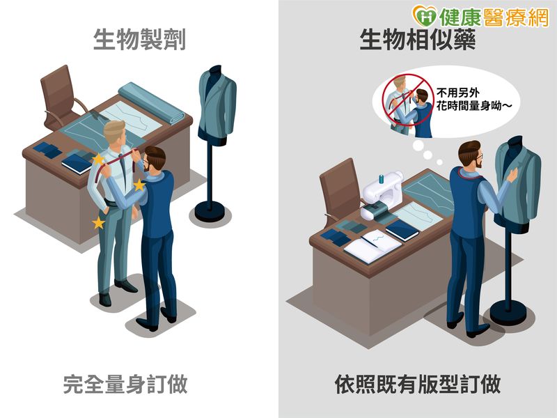 原廠生物製劑就好比一套客製化西裝,在第一次訂製時,因為需要量身、打版及裁縫,所以需要的時間及花費相對來說是最多的,而生物相似藥,就如同製作一套剪裁一樣的手工西裝,不過因為有參考版型,因此不需要再花時間重新量身訂做。這也是生物相似藥為什麼能比生物製劑節省醫療成本的主要原因。