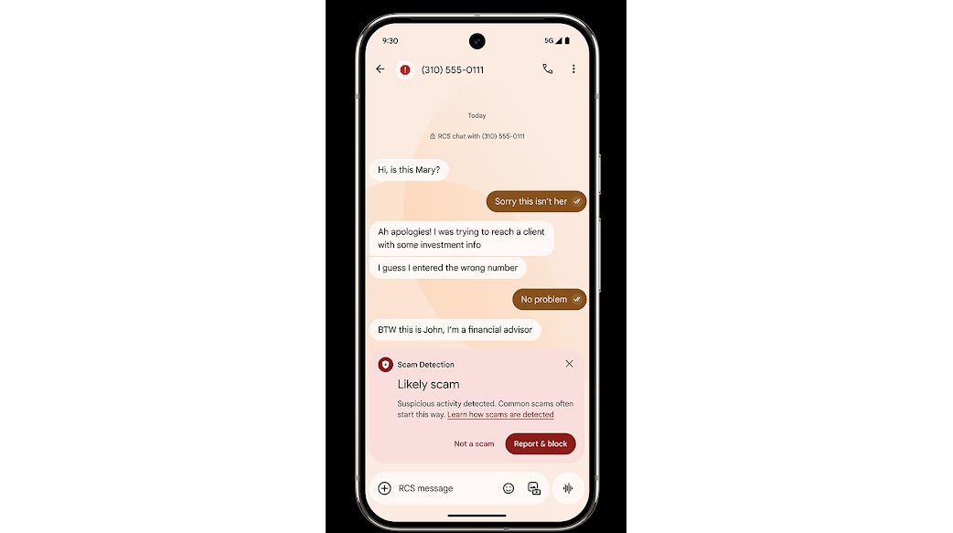 為了更有效應對這些「對話式詐騙」,Google 投入研發新 AI 偵測技術,表示透過其 AI 模型,能即時監測 SMS、MMS 及 RCS 訊息中的可疑模式,並在偵測到詐騙風險時,立即向用戶發出警告,提醒用戶該對話可能為詐騙,並提供快速封鎖或回報選項。