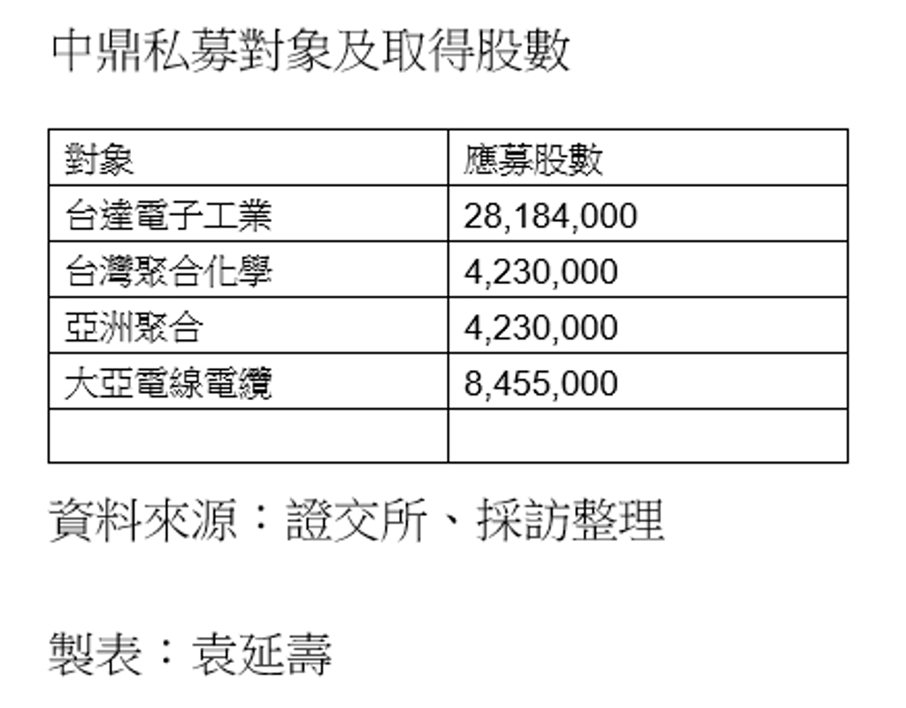此次中鼎所訂的私募價格為每股新台幣35.48元,預計此次私募資金約有16億元。